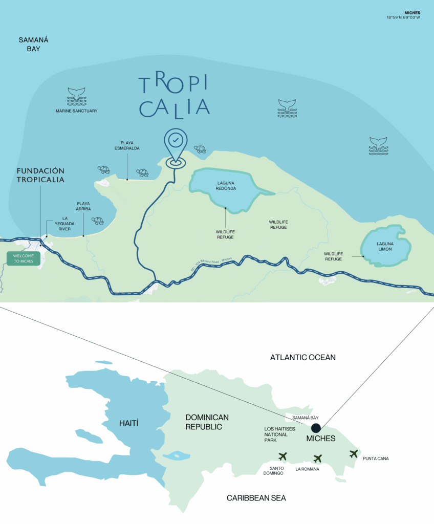 Tropicalia is located in the El Cedro Municipal District, within the Municipality of Miches, in the Province of El Seibo, on the southern coast of Samaná Bay. The area of influence is bordered to the east by the Lagunas Redonda and Limón Wildlife Refuge, and to the north and west by the Atlantic Ocean, which is part of the Bancos de la Plata and La Navidad Marine Mammal Sanctuary, where every year around 2,000 humpback whales migrate to reproduce and give birth in its warm waters.
